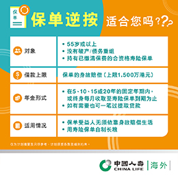 资料仅供参考,并不构成及不应被视作任何性质之建议、邀请或要约。就此资料作出任何决定前,建议向适当的专业人士寻求独立意见。客户应衡量自己的保险需要、合适性及负担能力等,不应仅根据此资料作出任何投保决定。中国人寿(海外)将尽力确保资料内容准确及完整,但不会就资料来源的可靠性、准确性、完整性及适时性或因而引致的任何索偿及/或损失负上责任及作出任何担保或保证。