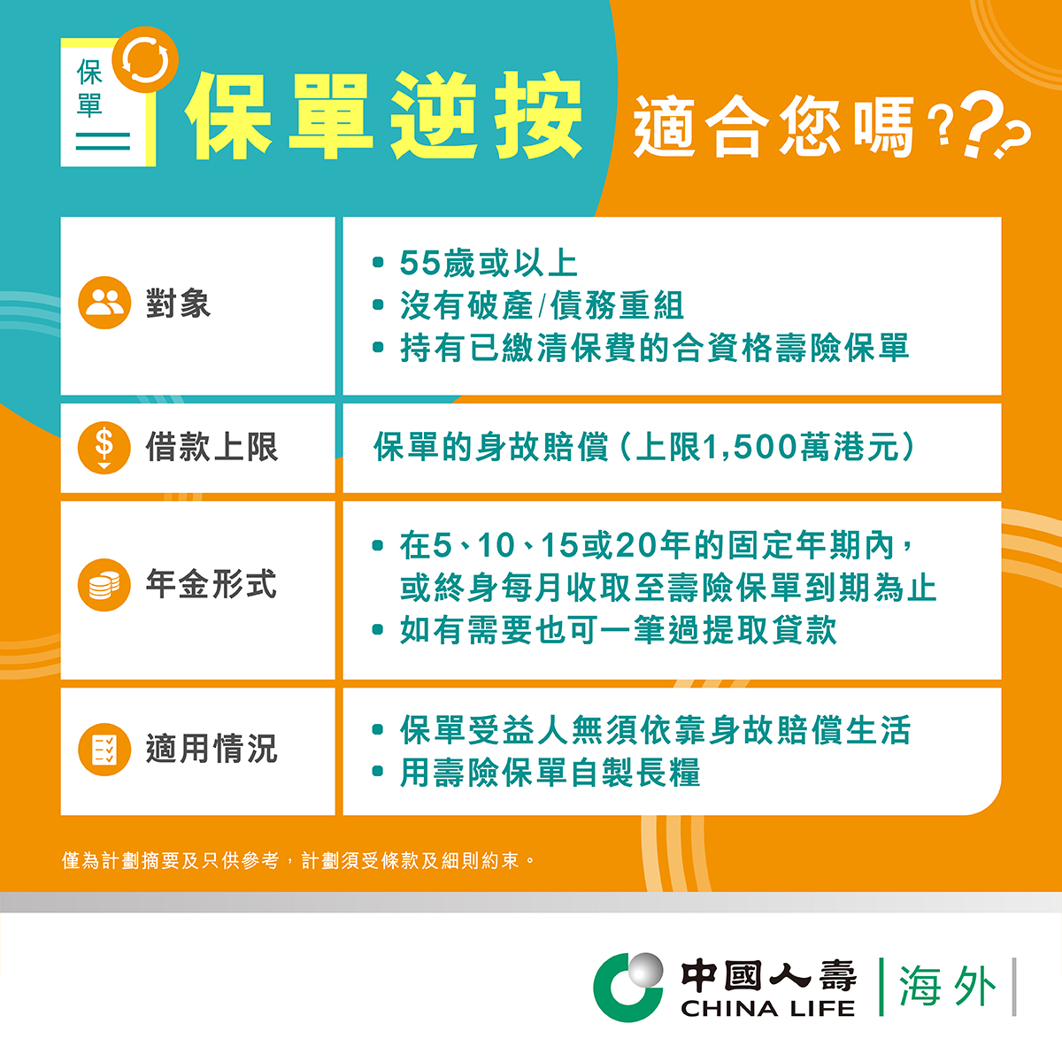 - 保單逆按計劃由香港按揭證券有限公司全資附屬機構香港按證保險有限公司(按證保險公司)營運。客戶必須符合按證保險公司規定之所有資格要求,方可申請有關保單逆按計劃下的貸款。計劃須受條款及細則約束,詳情請參閱有關宣傳單張或向按證保險公司查詢。